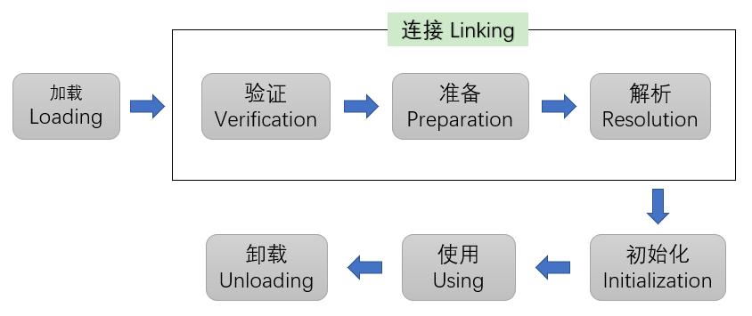 其中验证、准备、解析三个部分统称为连接(Linking)。