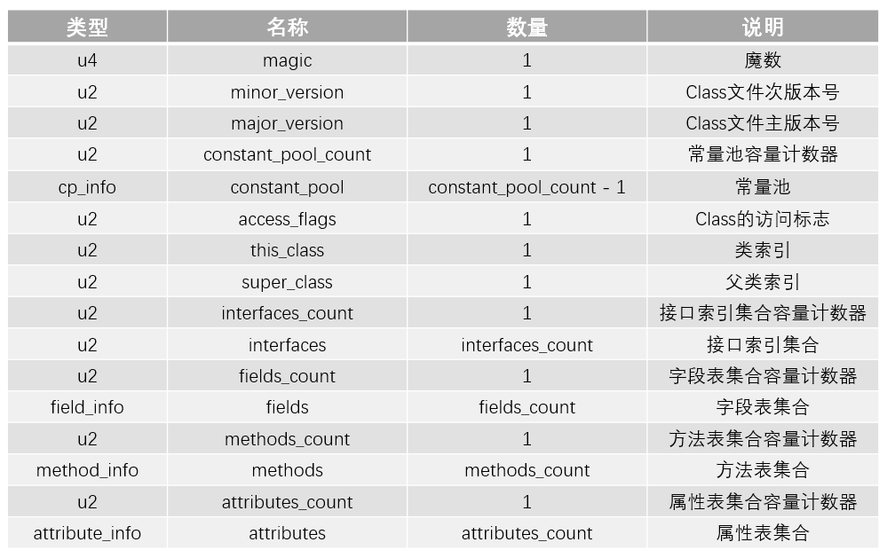 习惯性地以“_info”结尾。表用于表述有层次关系的复合结构的数据,整个Class文件本质上也可以