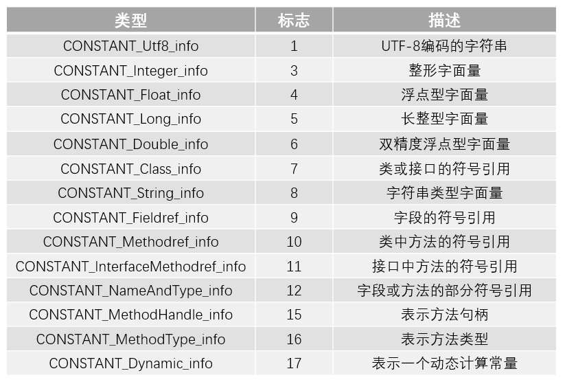 常量池中的每一项都是一个表,表结构起始的第一个位是个u1类型的标志位(tag),代表着当前常量属于